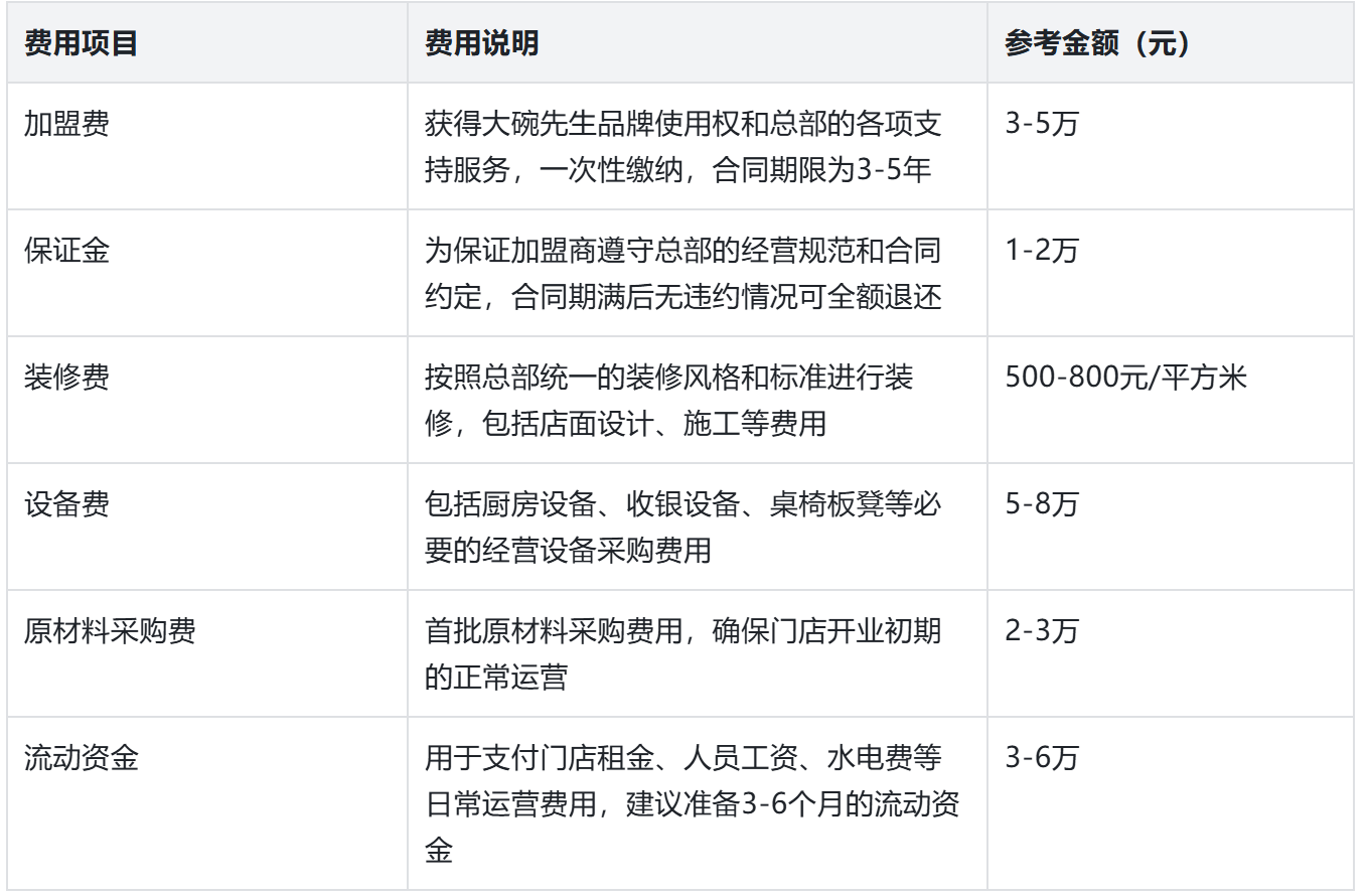加盟费用是投资者最为关心的问题之一,大碗先生秉持透明化的原则,将加盟费用明细清晰呈现,让投资者能够做到心中有数。具体的加盟费用会根据加盟店的所在城市级别、门店面积等因素有所差异,以下为参考费用明细: