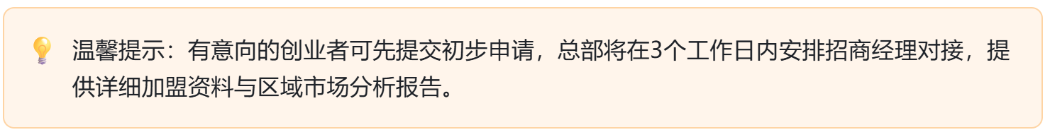 提交申请:通过品牌官网“加盟通道”或官方微信公众号填写《加盟申请表》,提交个人基本信息与意向城市;