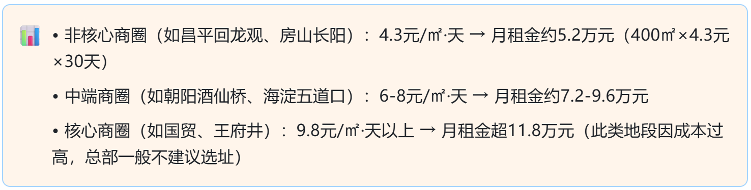 北京商铺租金因地段差异显著,根据2025年8月房天下最新数据(朝阳酒仙桥区域),400㎡餐饮底商租金区间为4.3-9.8元/㎡·天,换算后月租金如下: