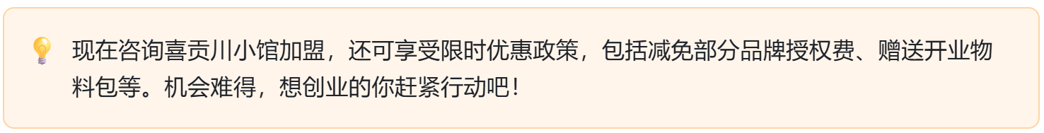 总而言之,喜贡川小馆加盟费用10 - 30万即可启动,门槛低、扶持全,是中小投资者进入川味小吃市场的优质选择。总部手把手教运营,从前期筹备到后期盈利全程护航,让你轻松当老板。如果你对喜贡川小馆加盟感兴趣,不妨尽快联系总部,获取更多加盟详情!