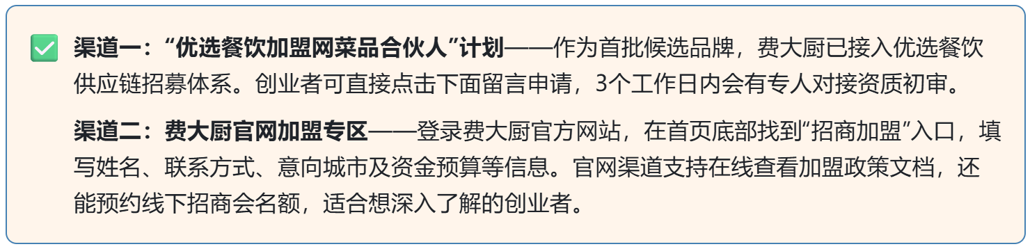 加盟第一步,找对入口是关键!别被网上的“第三方代办”忽悠,2025年费大厨官方合作招募主要通过以下两个正规渠道,安全性拉满: