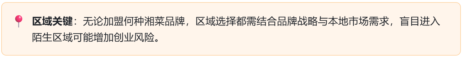 重点发展区域:优先开放湘菜消费基础好的华南、华东地区,对西北、东北等湘菜接受度较低的区域,会要求加盟商具备更强的本地化运营能力。
