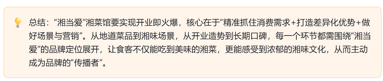 开业火爆只是起点,长期运营需依靠“口碑”积累。“湘当爱”需做好以下两点: