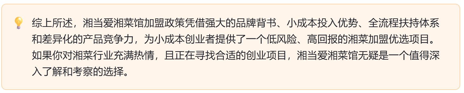 在餐饮市场中,湘菜凭借其鲜辣爽口的独特风味,深受广大消费者喜爱,成为极具发展潜力的品类。而湘当爱湘菜馆作为湘菜领域的知名品牌,凭借完善的加盟政策和显著的加盟优势,成为众多小成本创业者的优选项目。本文将从品牌、成本、扶持等多个维度,深入分析湘当爱湘菜馆加盟政策的核心优势,为创业者提供全面参考。