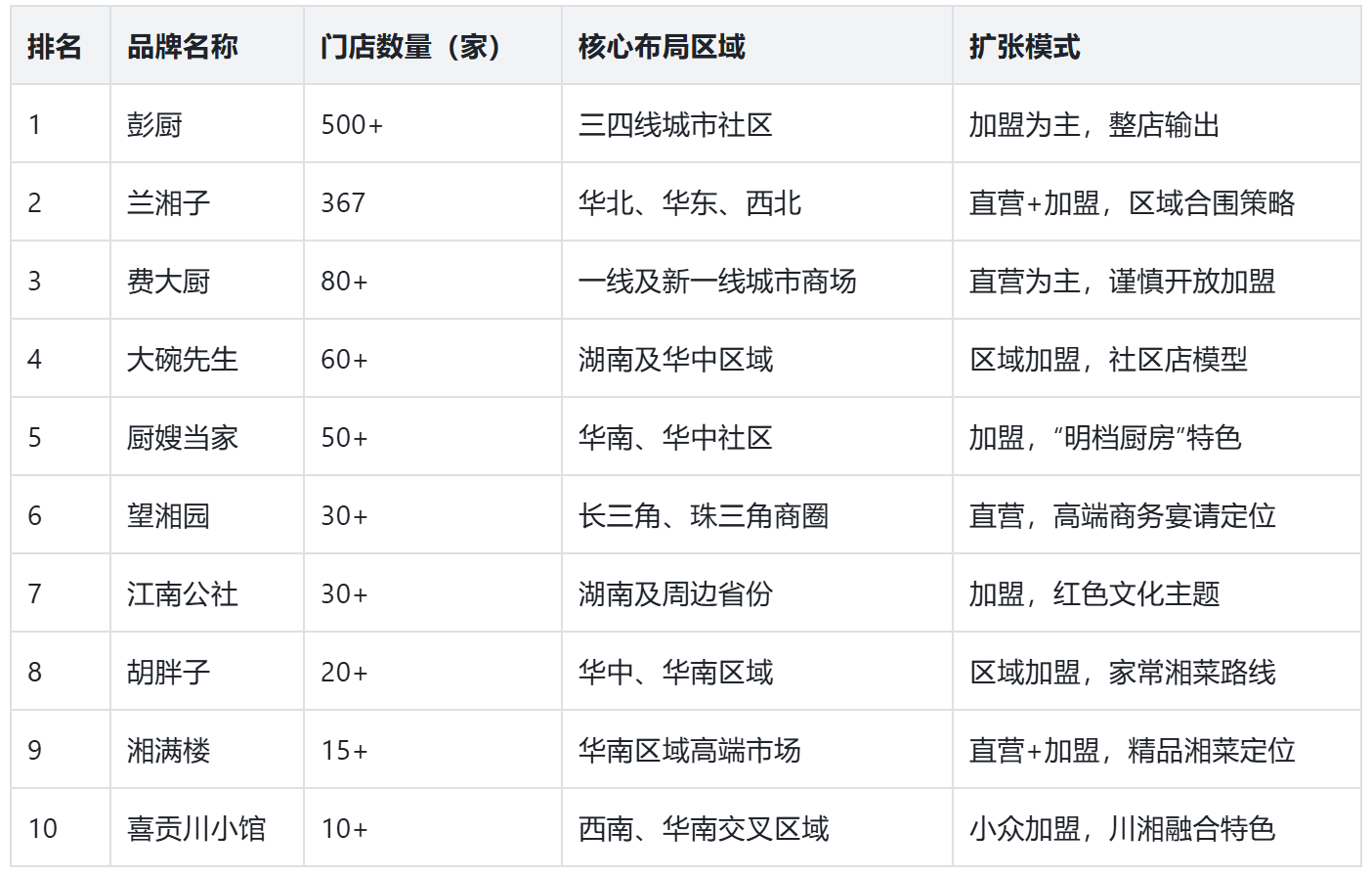 基于行业调研及品牌公开信息,十大湘菜品牌的门店规模呈现显著分层。头部品牌凭借标准化体系与供应链优势拉开差距,区域品牌则在细分市场深耕细作。