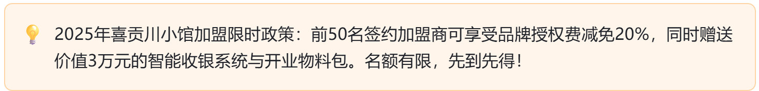 喜贡川小馆深知创业者痛点,打造“全程保姆式”支持体系,让加盟开店更省心、更放心,这也是其成为2025热门川味餐饮加盟项目的关键原因。